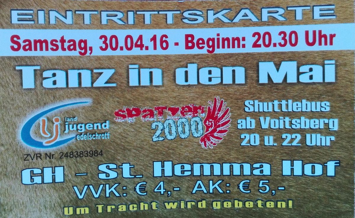 Wir laden euch alle recht herzlich zu unserem Fest Tanz in den Mai ein. Das Fest findet am Samstag, dem 30.04.2016 um 20:30 Uhr im Gasthaus St. Hemma Hof statt. Musikalisch werden uns die Spatzen 2000 betreuen. Vorverkaufskarten kosten 4 € und Abendkassa 5 €. Shuttelbuse zu unserem Fest gibt es auch. Abfahrzeiten in Voitsberg sind um 20 und 22 Uhr. Um Tracht wird gebeten. Wir freuen uns auf euer Kommen.